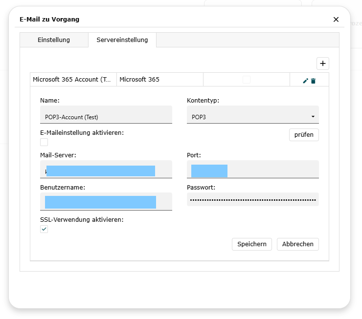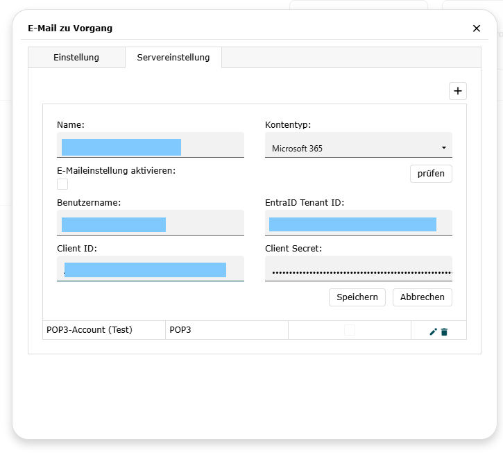 Zudem haben Sie zusätzlich die Möglichkeit, ein Microsoft 365-Konto anzubinden. Dadurch können E-Mails direkt von einem Microsoft-Account abgerufen und automatisch als Vorgänge verarbeitet werden. Für die Einrichtung sind vorab Konfigurationen in Ihrem Microsoft-365-Mandanten notwendig, um den Zugriff über die Anwendung zu erlauben. Anschließend tragen Sie folgende Informationen ein:
