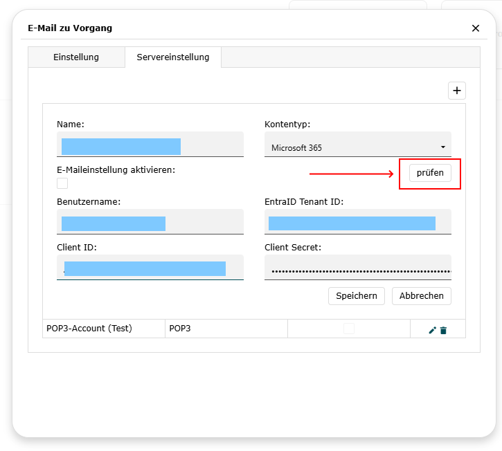 Sobald alle erforderlichen Daten für einen Kontotyp – wie z. B. bei Microsoft 365 oder POP3 – vollständig eingegeben und gespeichert wurden, kann über die Schaltfläche „Prüfen“ eine automatische Überprüfung der Konfiguration gestartet werden.